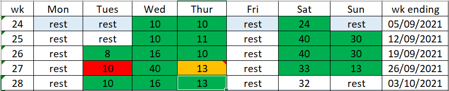 September has all been about putting the miles in, with three weeks of high mileage which felt like IT WOULD NEVER END! The first week was dandy, but I started to get tired during the second week and the third week became a case of grinding out the runs one at a time. Still, it’s done now, I’m in a 3 week taper with volume reducing on a weekly basis until race week when I do just a couple of short runs before the big day.