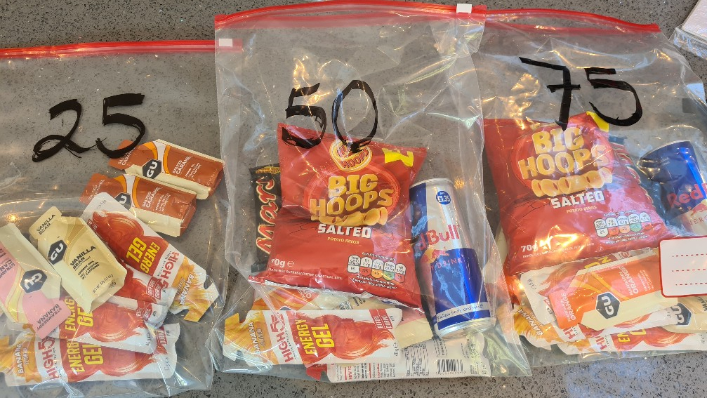 The Centurion aid stations are well stocked, so I could throw myself entirely upon their mercy food-wise, but I want some level of control over the calories I need to take on. My start line vittles are as follows: