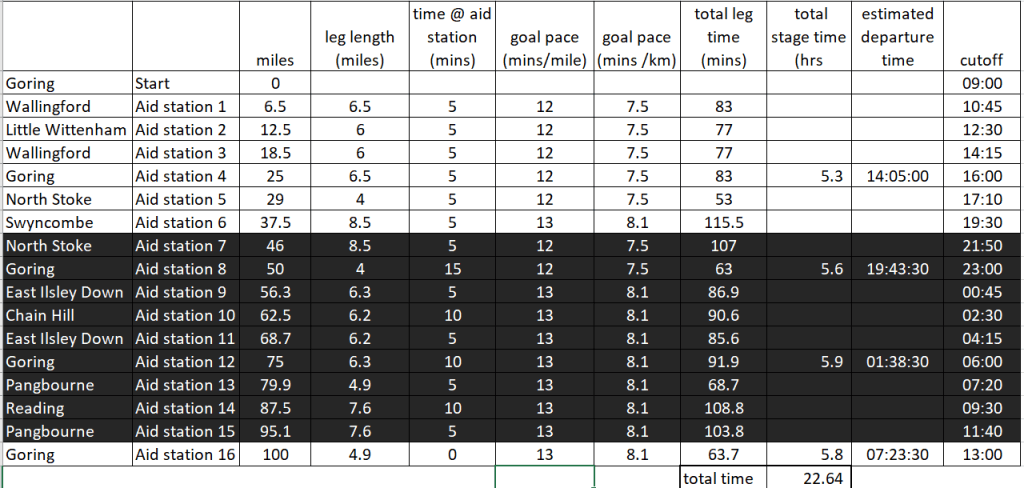 I have no idea what to expect from a 100 mile race. Will my legs give up? Will my head give up? How hard will the final 50 or 60km be? How much running will I be capable of? Will I be able to eat enough? No idea! Still, it pays to have a plan, I think. I’m aiming for a sub-24 hour time for the whole thing, bagging me a special “One Day” buckle. I’ve broken the race up into sections, using the aid stations as handy milestones. In ultra terms, I’m allowing myself a reasonably sporty start as Leg 1 is dead flat and I’ll be on fresh legs. In fact, it’ll be a job to hold myself back to a 12 minute mile pace. I plan to run/walk from the start, using an 8:2 minute ratio. This will help slow my average pace a bit. I’ve allowed what feels like plenty of time at aid stations. In reality I expect to improve on this, I won’t spend more than 1-2 minutes at most of them so should gain some time as I go. Regardless, as someone once said, no battle plan survives contact with the enemy, reality could be substantially different. Someone else said that the only thing more useless than a battle plan is not having one at all! So, here is my pace plan, for what it’s worth.