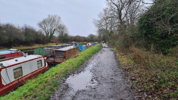 I battled on, my shoes feeling heavy and waterlogged, my Sealskinz socks sodden at least on the outside. The post-industrial canalscape of graffiti-adorned bridges, fly tipping, shopping trolleys and knackered old barges didn’t exactly lift the spirits either! I began to wonder idly how long it would take me to finish. Mistress Garmin was telling me I could finish in under 8 hours, just, but this was based mostly on my faster early pace. Her predictions began to slip a little at a time as my slower plod began to affect the averages. It never got more than 2 minutes above the 8 hr mark, so I started to wonder if I could sneak in under 8. Funny how arbitrary round numbers can have that effect. I got more disciplined with the 8 minutes running, more or less sticking to that through to the finish. The canal splits at one point, with a friendly sign telling us all that there was only a half marathon to go if we took the correct spur off to the left. This cheered me up a little, I mean come on, a half marathon? Piece of cake. I think the rain stopped here too for a while, and the surface was now pretty good. No excuses!
