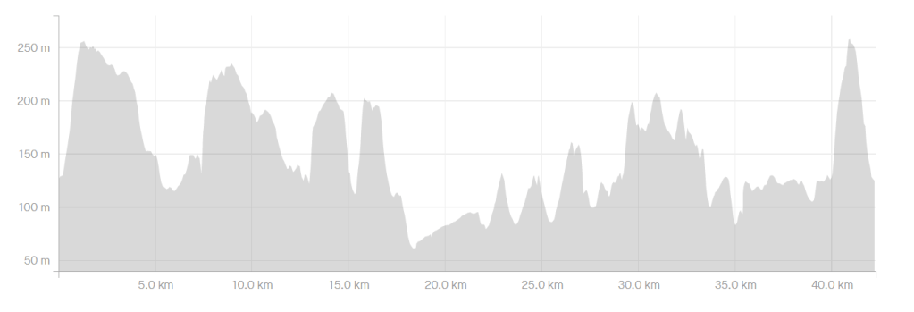 I had 5 hrs in mind as a reasonable target for a training run of this distance, any 2020 era marathon-related thoughts of sub-3.5 rendered ridiculous by the terrain. Race day magic did its usual thing, however, and with a rush of blood to the head I was cruising along nicely on the flats and downs. I skipped through the first aid station at 10km, stopping only long enough to grab a couple of flapjacks. At the half way stage I was at around 2h13mins and thinking that a sub 4.5 hrs might be on. It soon became clear that I had not taken into account the fatigue in my legs from the first half due to the hillage, going a bit quicker than planned, and in particular running hard down the hills. The second half of the race had plenty more hills to offer, in fact having slightly more climb than the first half.
