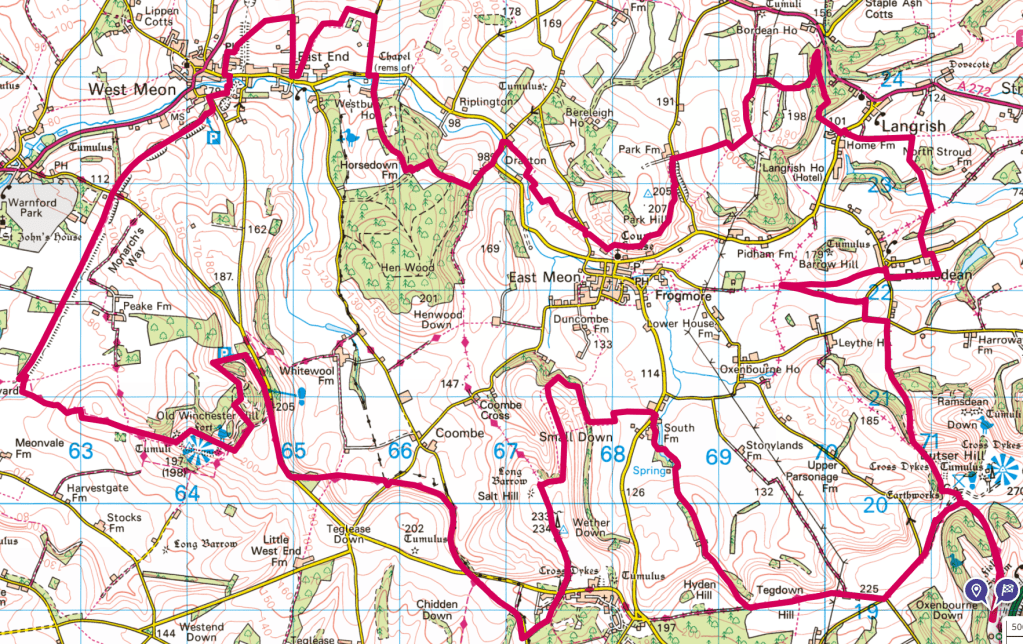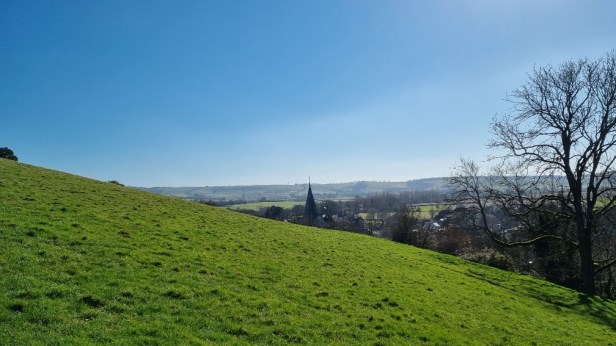 I kept going, ticking off the kilometres. My limited ultra experience tells me that however far away it seems, if you do enough of that, the finish line will eventually come. Despite weary legs, I was mainly having a great time, helped greatly by the fantastic conditions and the far-ranging views this afforded. I took this photo about a quarter of the way up a big hill, with my head level with the top of the church steeple. By the time I got to the top, the entire village of East Meon was far below me.