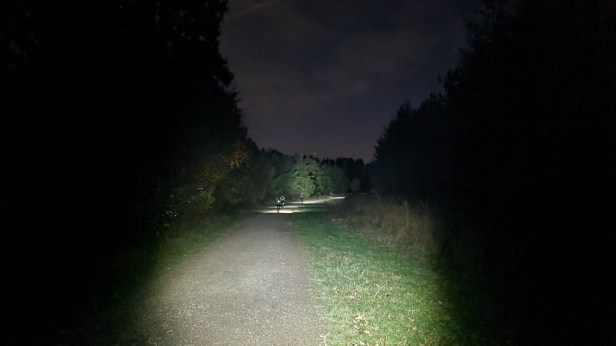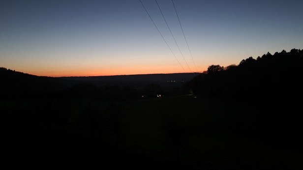 I treated myself to my first sit down of the race before heading out on Lap 4, just 5 or 6 minutes. I had a cup of coffee and some strawberry cheesecake (thanks Kerry!). I swapped my daft sun hat for a cap, got my head torch out, put on an extra layer and headed out for the penultimate time. Although I had arrived in good light at the end of Lap 3, by the time I left the tent it was pretty gloomy out and in the trees it was dusk. I felt great! I like running in the dark, I’d had a sit down, and I think had recovered from Lap 2’s hydration cock-up. And I’d had coffee. And cheesecake! One way or another, legs somewhat refreshed, I was already having more fun than on Leg 3. By the time I got to Powerline the last remains of daylight were disappearing over the horizon. I jogged along, really beginning to resent the aforementioned dastardly loop around the mid-point aid station. The two big climbs were getting very old and this time around I was stopping for little rests on the way up. I caught up with Spencer at Hale Lane and we hiked up the hill to Boulevard together before pulling slightly ahead on The Snake. Trig Point was re-acquired at just under 9h20 minutes into the race. 2h40 for that lap – slower still. Would I be able to sneak home in under 12 hours? Let’s see.
