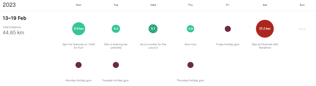 We had a family trip to Dubai in mid February. Fortunately it isn’t too hot there yet, a quite manageable 15-20°c until 9am when it does start to heat up. I was also lucky to have access to the gym on our host’s compound. This had everything I needed, although not always in the weight combinations I needed. For the most part I erred on the side of increasing weight even if the plan didn’t demand it. I surprised myself by being able to easily manage the increase which led me to adjust up the weights more than I originally expected in the following weeks. Whilst in Dubai, my nephew tempted me into joining him for a half marathon race in a neighbouring Emirate. The Ras-al-Khaimah Half was duly undertaken. I wasn’t totally sure how to handle it. My training plan had prescribed a 90 minute easy run, so I was definitely going to be over budget on time. In the end, I decided that while I wasn’t sufficiently race tuned for a PB attempt, I could afford to see if I could split the difference between an easy effort and pb pace, aiming to sneak in under 1h50.