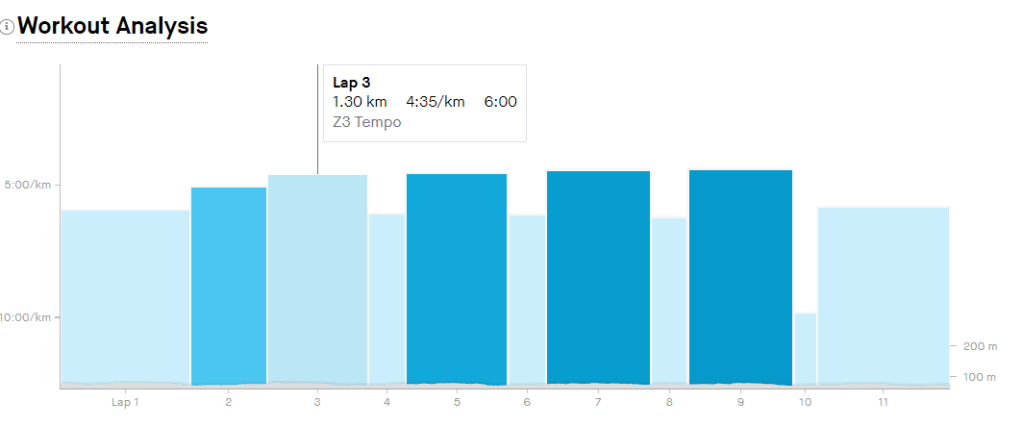 Tuesday’s run was an interval training session, four 6 minute efforts with 3 minutes rest. I have a love-hate relationship with speedwork. They always seem a bit daunting, lurking there in the plan, but in the doing I quite enjoy them. This time around I was able to maintain a 4:30 pace, ish, for each of the four intervals.