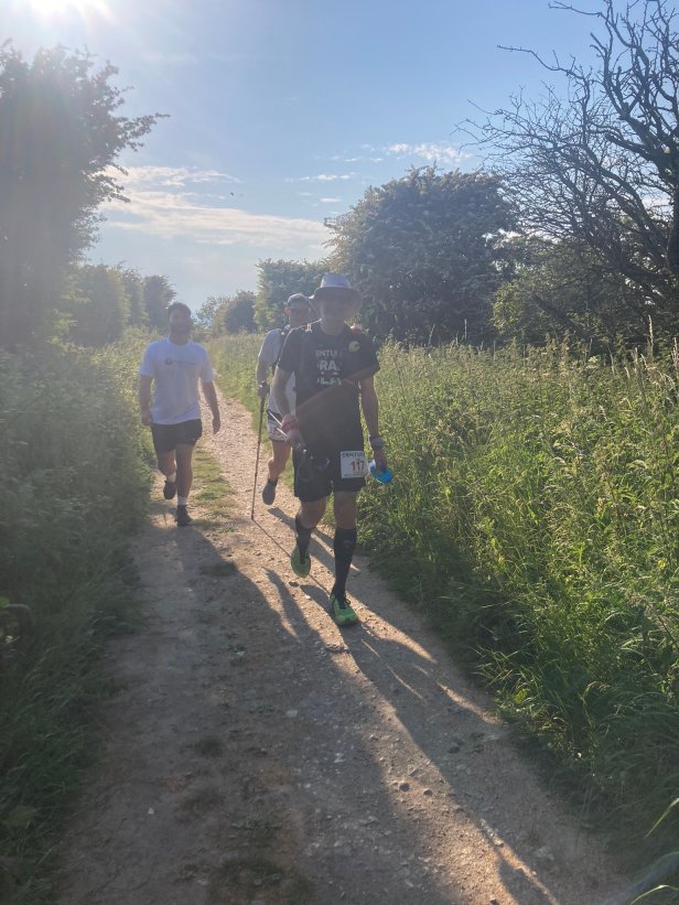 The race starts with a couple of laps of Matterley Bowl, a natural amphitheatre near Winchester. I stuck with my conservative 3:7 run:walk strategy from the start. This quickly meant I was near the back, but I was content to play the long game. The offending glute was a bit achey and stiff when running, but didn’t really give me too much cause for concern. Despite not really running much, my strong hiking game meant I was making good time, reaching Beacon Hill Beeches checkpoint about 15 minutes ahead of plan. Queen Elizabeth Country Park (22 miles) was reached in good order, about 45 minutes ahead of plan. This was very encouraging – if I could continue at this apparently very manageable pace, I would come in well under 24 hours. About then the sun became very hot, and stayed that way until well into the evening, getting to over 30 degrees. Very warm indeed, doubly so when you factor in the sun bouncing back up at you off the white chalk that forms much of the trail on the Downs. And there is very little shade, a lot of the route is exposed. As I was ahead of plan, and because I wasn’t really in a rush, I decided to ditch the running and just hike until it cooled down enough to run again. I saw a lot of overheated people during the afternoon as I power-hiked past, getting a lot of compliments on my strong hiking pace. The aid stations in the afternoon were like a field hospital – runners laid out on the ground, red in the face, looking thoroughly done in.