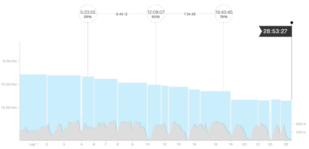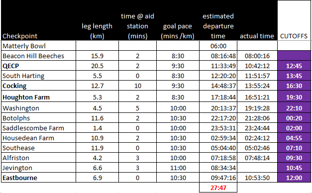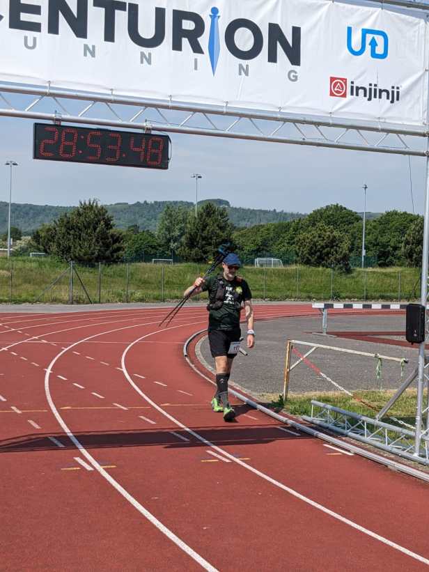 I suppose I should point out that despite all the moaning and complaining, I did eventually finish the race, in 28h53. This was about an hour longer than my conservative plan suggested it would take, with all of that damage done in the last 15 miles when I was reduced to 20 minute miling.